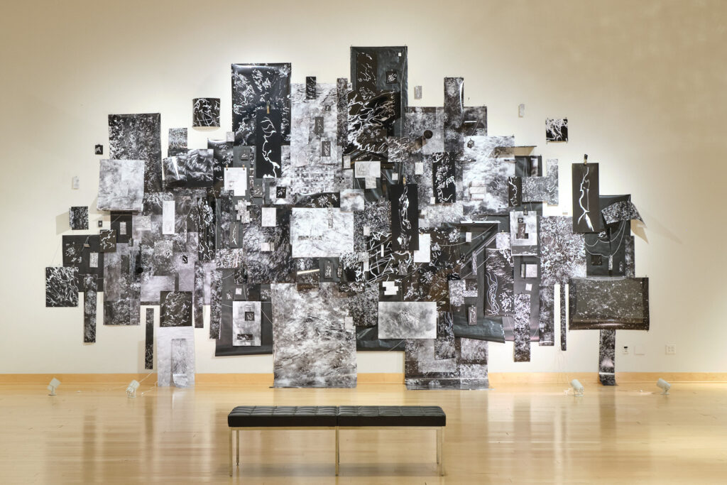 In my photo installation A Fools Errand, I tried to explore these ideas by photographing the exact same spot in a stream for months on end. The tripod stayed in the exact same position and the camera framing never changed. I would tweak the exposure time slightly based on the time of day but that was it. I took these thousands of abstract photographs, turned them black-and-white to emphasize the reflections, and printed them on a very large scale. To add to it, I’m really interested in making photographs more sculptural, so I adhered the photos to PVC boards, cardboard tubes, plates, tiles, strings, and installed it all in a way that was sort of jutting out from the wall. The intention was that it would change as the viewer walks around the piece, just like how walking around a stream brings out new perspectives within it.